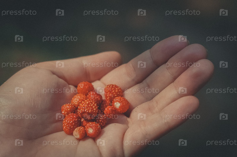 Лесная клубника в ладони крупным планом. Зернистая пленка в стиле старых фотографий