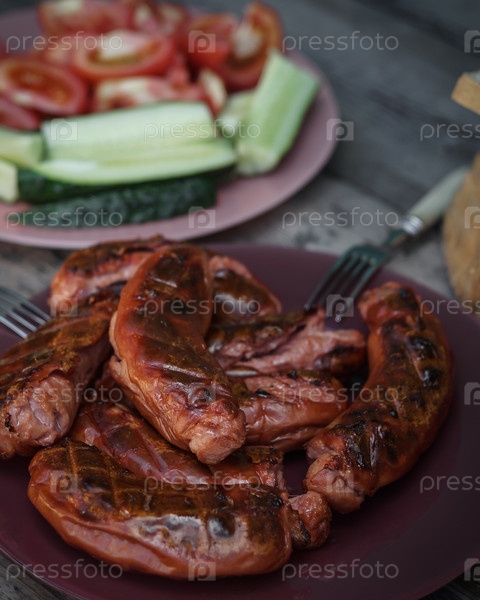 Горячие сосиски с грилем крупным планом. Вариант сервировки с нарезкой овощей на деревянном столе. Вертикальная композиция