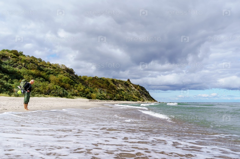 Турист стоит на берегу моря. Спокойное море и песчаный берег