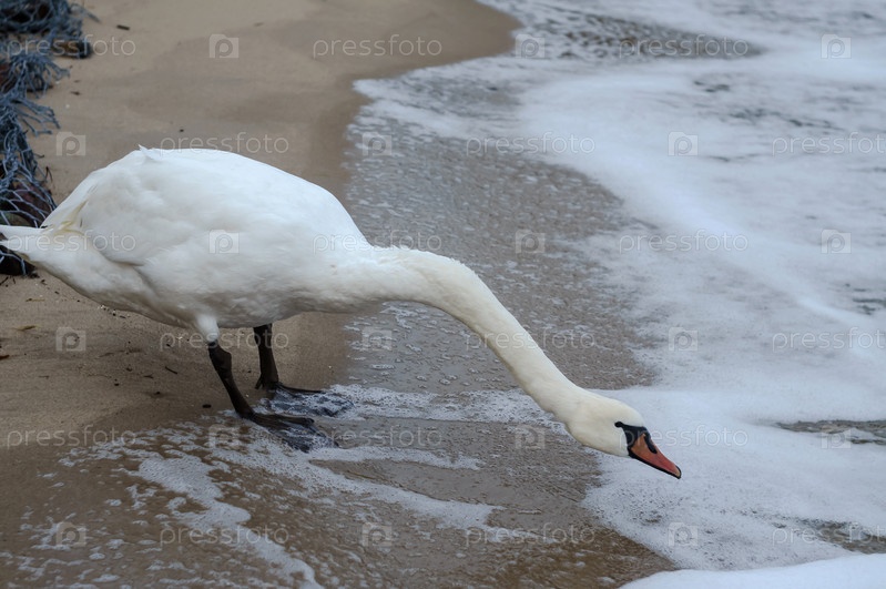 Лебедь на море. Белая птица на фоне песка. Белый лебедь