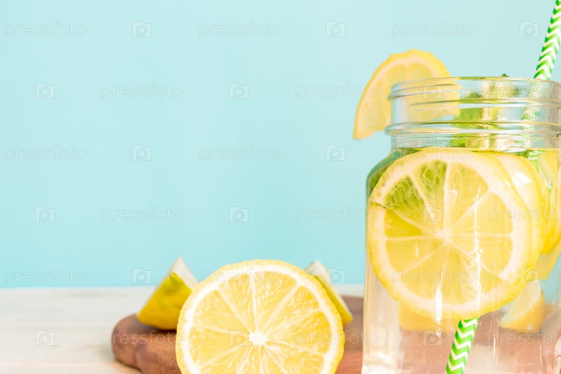 Цитрусовая лимонадная вода с нарезанным лимоном и мятой, здоровый и детокс-напиток летом на деревянном столе с синим светлым фоном