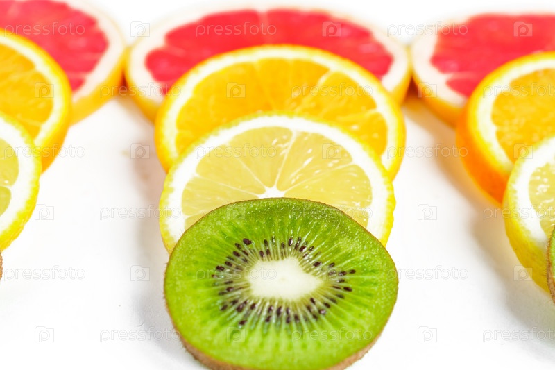 Крупным планом ломтик цитрусовых, киви, апельсины и грейпфруты, изолированные на белом фоне. Фруктовый фон