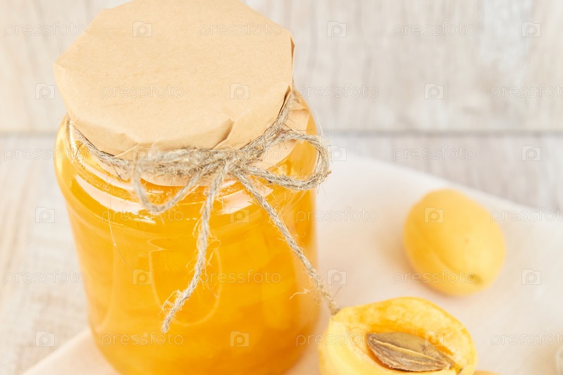 Стеклянная банка с домашним органическим абрикосовым джемом на деревянном столе. Деревенский стиль, выборочный фокус