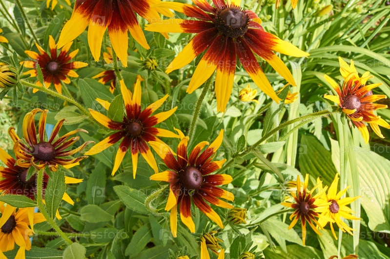 Яркие цветы рудбекии в летнем саду