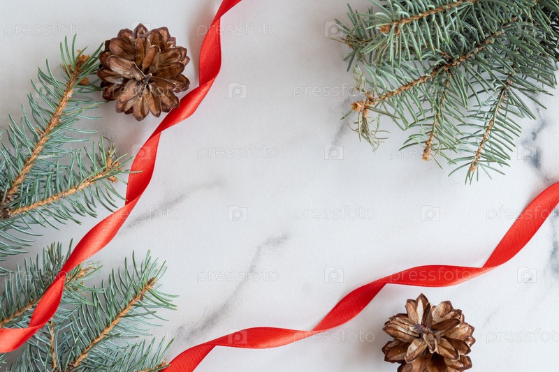 Рождественская и новогодняя открытка с копией пространства. Синие хвойные ветки, шишки и красная атласная лента на фоне белого мрамора
