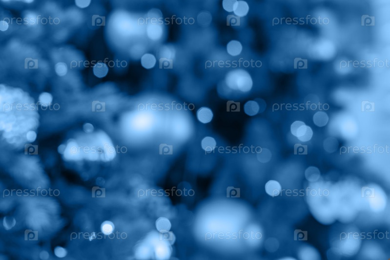 Трендовый цвет 2020 классический синий, фон рождественских и новогодних праздников. Расфокусированные елки, украшенные шарами и гирляндами