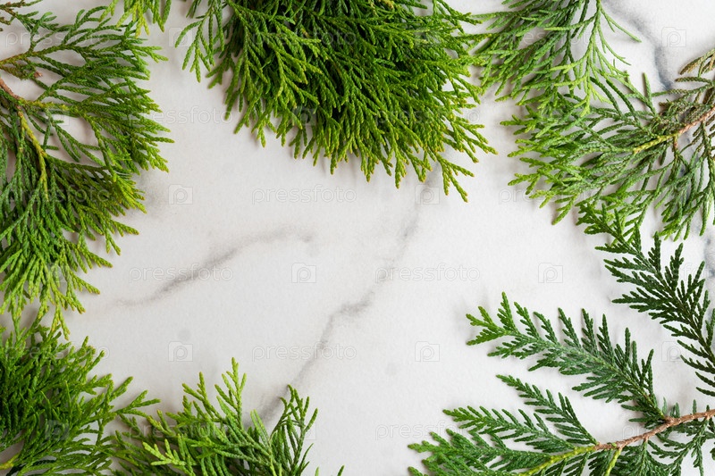 Каркас из веток белой кедровой туи на фоне белого мрамора, плоская планировка. Макет карты с копией пространства