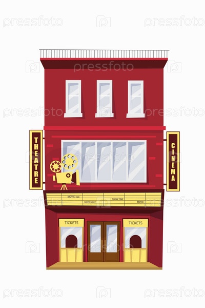 Здание кинотеатра, фасад города изолирован на белом фоне. Векторная иллюстрация
