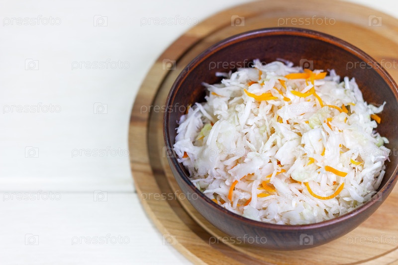 Квашеная капуста с морковью в миске на деревянном фоне с копией пространства. Маринованные овощи