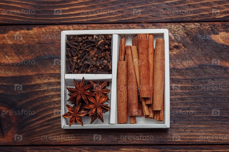 Анисовые звезды, палочки корицы и гвоздика в белой картонной коробке на коричневом деревянном фоне крупным планом, вид сверху, концепция специй для выпечки и напитков, глинтвейн, Рождество и здоровая пища