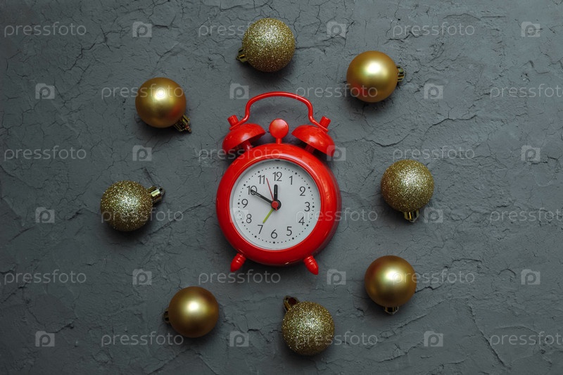 Красные часы с золотыми рождественскими игрушками, матовые и блестящие на сером фоне винтажной шпаклевки, вид сверху, крупный план, плоская композиция, концепция ожидания Рождества, Нового года, Сочельника, украшения дома