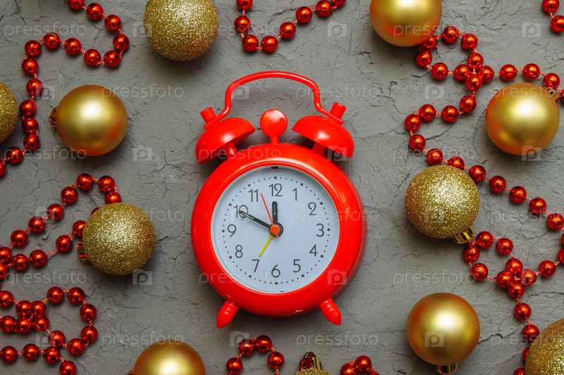 Красный будильник показывает без десяти двенадцать на сером размытом фоне, вид сверху, крупный план с новогодними золотыми шарами, матовыми и блестящими, и красными бусинами, концепция ожидания Рождества