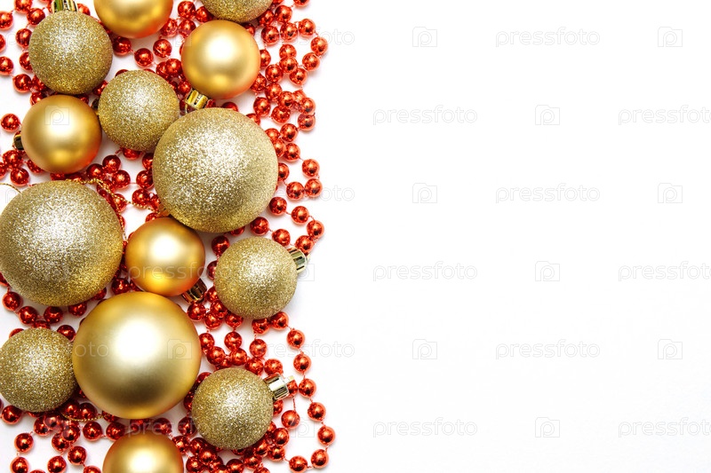 Золотые рождественские шары матовые и блестящие разных размеров с красными бусинами, гирлянды на белом изолированном фоне крупным планом, вид сверху с пустым пространством для текста, концепция Новый год, шаблон и дизайн