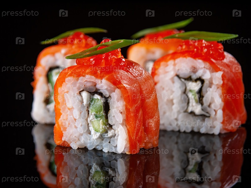 Роллы Филадельфия с красной икрой крупным планом на черном фоне. Японская кухня. Выборочный фокус. Горизонтальный