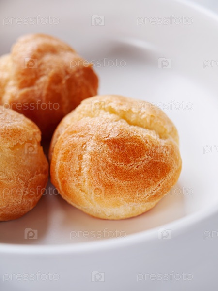 Свежие профитроли крупным планом в белой тарелке. Вертикальный. Выборочный фокус