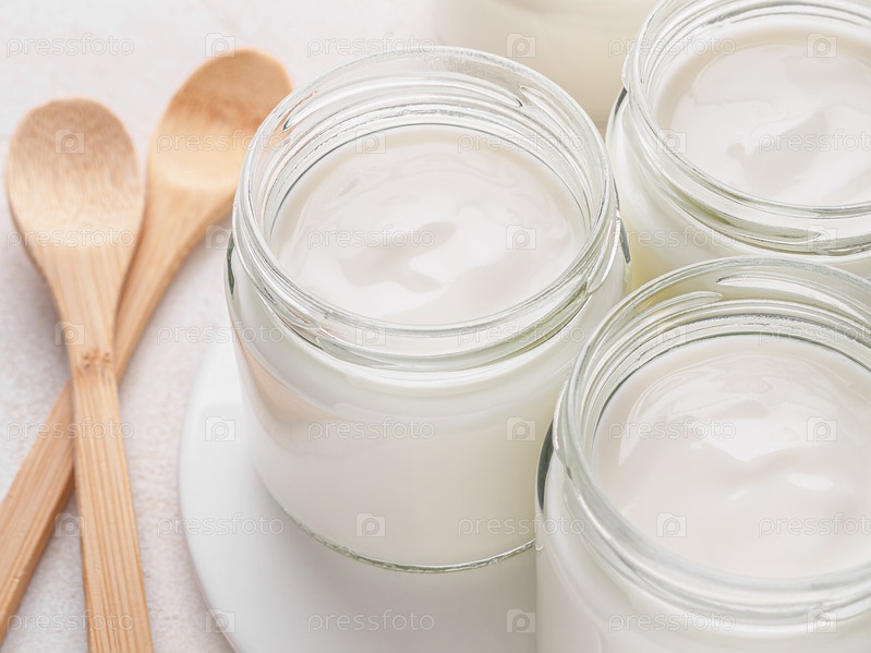 Крупный план стеклянных банок домашнего простого йогурта с деревянными ложками на белом подносе. Горизонтальный. Крупным планом