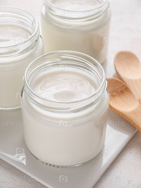 Стеклянные банки домашнего простого йогурта с деревянными ложками на белом подносе. Вертикальный. Крупным планом