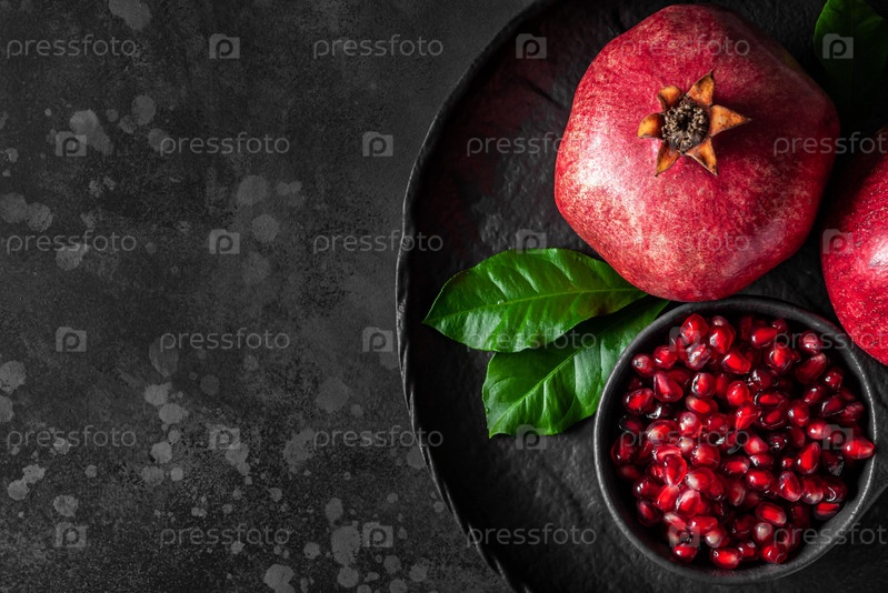 Гранат на темном фоне, вид сверху, низкий ключ, горизонтальный, пространство для копирования