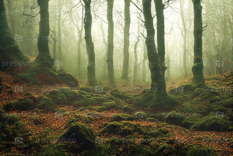 Древний таинственный лес в тумане. Зоросшие мхом деревья и поляны. Густой лесной пейзаж. Реалистичная цифровая иллюстрация. Компьютерная графика