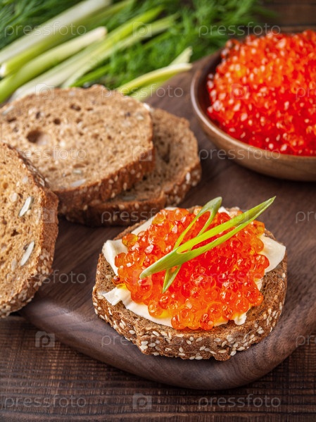 Бутерброд с красной икрой на деревянном подносе в окружении хлеба, икры и трав, вертикальный