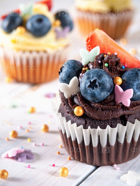 Закройте шоколадные и ванильные кексы со сливками, черникой и украшением на белом деревянном столе. Вертикальный