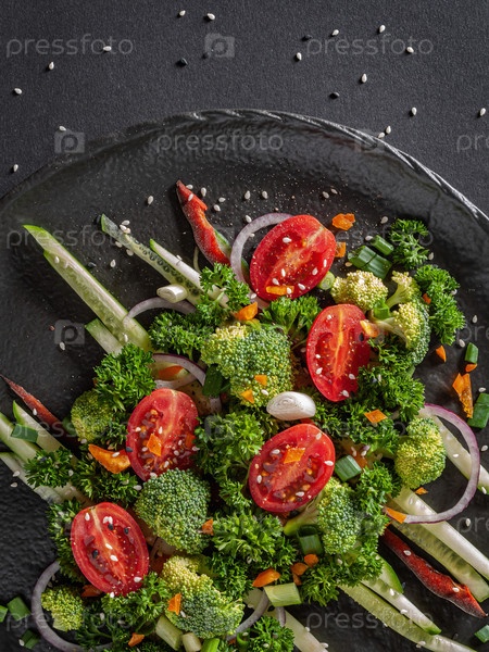 Здоровый овощной салат на тарелке, вертикальная ориентация, пространство для копирования