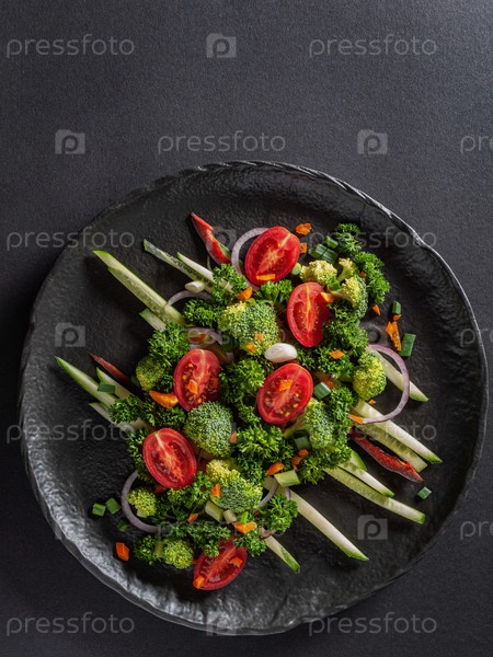 Здоровые нарезанные овощи на тарелке, вертикальная ориентация, пространство для копирования, вид сверху