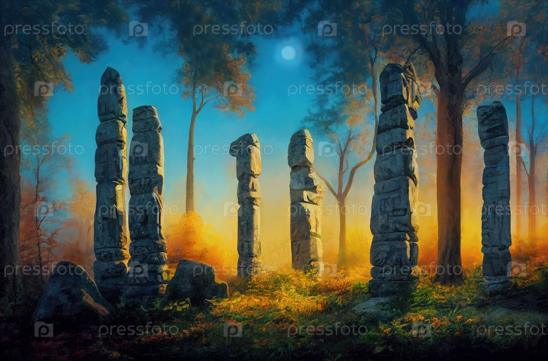 Мегалитические каменные столбы в ночном лесу. Древнее место силы. Реалистичная цифровая иллюстрация. Концепт-Арт. Компьютерная графика