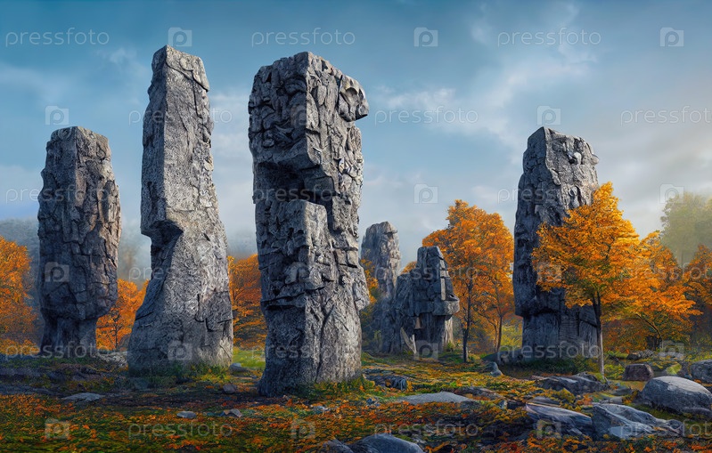 Мегалитические каменные сооружения в осеннем лесу. Каменные столбы древней цивилизации. Реалистичная цифровая иллюстрация. Концепт-Арт. Компьютерная графика