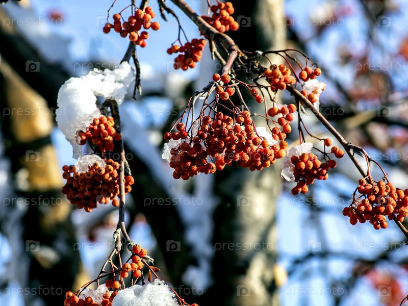 Красные ягоды рябины на ветвях, покрытых снегом