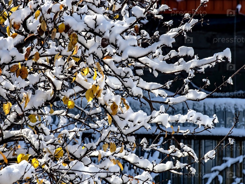 Ветки деревьев с желтыми листьями, покрытые снегом