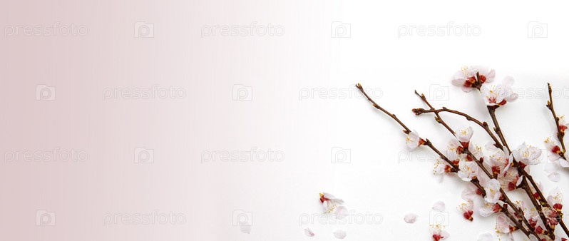 Цветы, ветки сакуры и вишни на бело-розовом фоне крупным планом расфокусированы с мягким фокусом с пустым пространством для текста, копией пространства, баннером, концепцией рекламного шаблона и упаковки