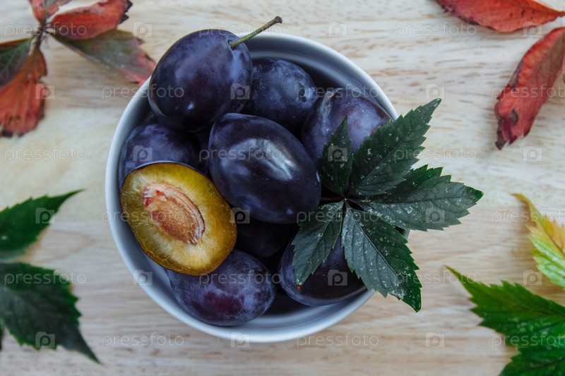 Спелые и сочные сливы в белой миске целые и нарезанные костью на деревянном кухонном столе сверху с зелеными, красными и желтыми осенними листьями крупным планом