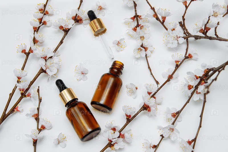 Косметические флаконы из коричневого стекла с пипеткой на белом фоне с цветущей вишней на ветвях с пустым местом для текста, копировальным пространством, плоской планировкой, концепцией ухода за собой, лицом, руками