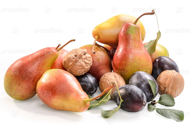 Груши, сливы и грецкие орехи на белом фоне с мягкой тенью