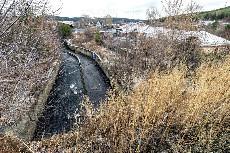 Черная река после плотины на выходе из городского пруда у города Сысерть под Екатеринбургом