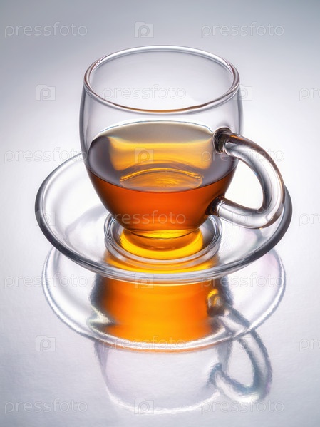 Прозрачная чашка чая с блюдцем с отражением на зеркальной поверхности. Вертикальный. Выборочный фокус. Студийный снимок