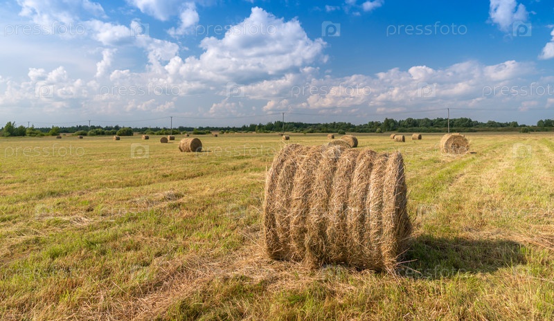 Сено в рулонах на поле, на фоне голубого неба с облаками