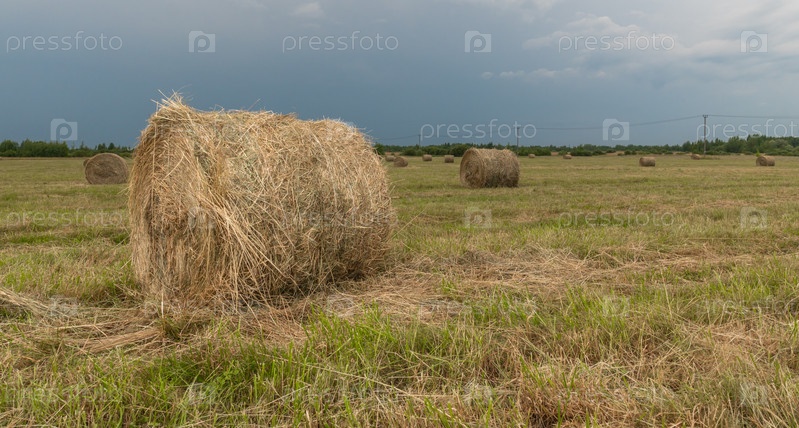 Сено в рулонах на поле, на фоне голубого неба с облаками