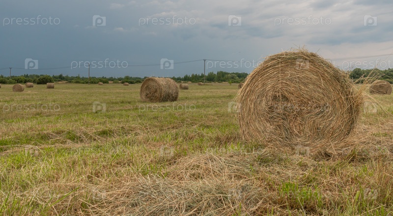 Сено в рулонах на поле, на фоне голубого неба с облаками