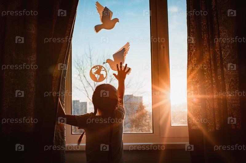 Ребенок протягивает руки солнечному свету, за окном летит голубь мира с веткой силы земного шара. концепция мира во всем мире, без войны, экология
