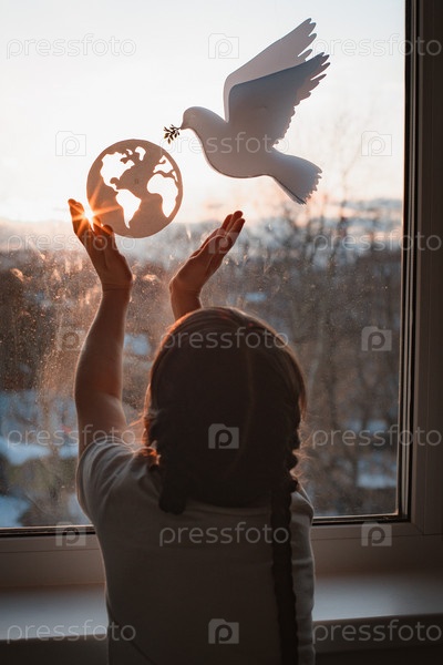 Ребенок протягивает руки солнечному свету, за окном летит голубь мира с веткой силы земного шара. концепция мира во всем мире, без войны, экология