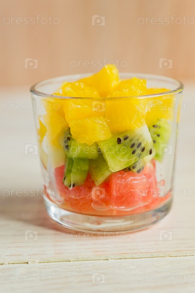 Диетический свежий вкусный фруктовый салат в стеклянной банке на деревенском деревянном фоне. Нарезанные сочные апельсины, киви и грейпфруты
