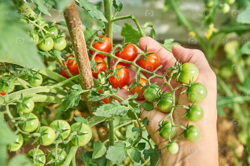 Женские руки собирают свежие помидоры черри в саду в солнечный день. Фермер собирает органические помидоры. Концепция выращивания овощей