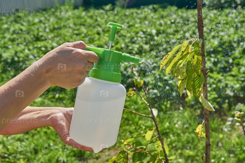 Летом фермер распыляет пестициды ручным распылителем против насекомых на вишневом дереве в саду. Концепция сельского хозяйства и садоводства