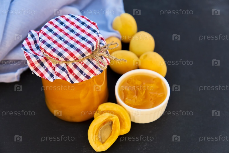 Стеклянная банка с домашним органическим абрикосовым джемом и спелыми абрикосами на черном фоне. Деревенский стиль, выборочный фокус