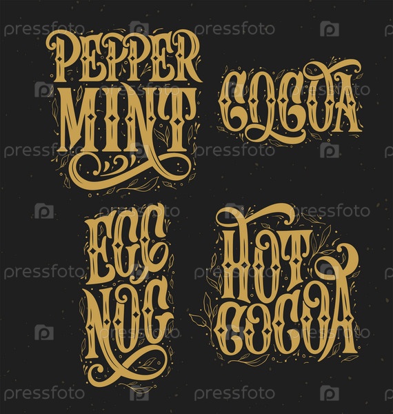 Векторная иллюстрация. Перечная мята, какао, горячее какао, векторный текст с каллиграфическим письмом. Каллиграфические надписи ручной работы