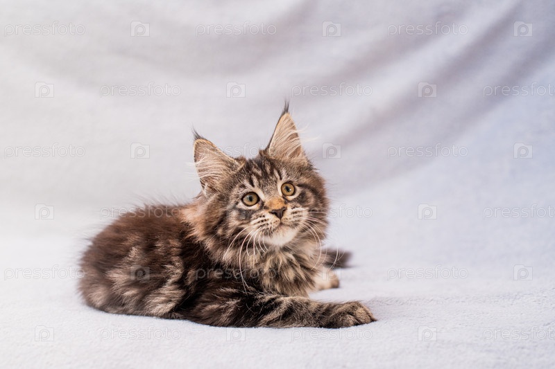 Табби котенок Мейн Кун лежит на легком пушистом одеяле