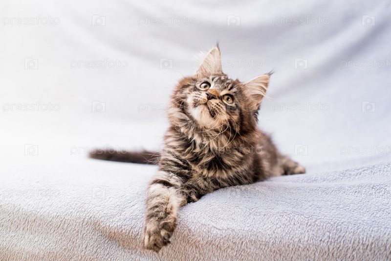 Табби котенок Мейн Кун лежит на легком пушистом одеяле