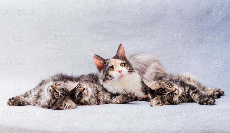 Мама-кошка семьи мейнкун и три котенка лежат на легком пушистом одеяле